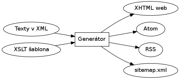 - Automaticky se vyrobí agregované výstupy: RSS, Atom, sitemap.xml.
