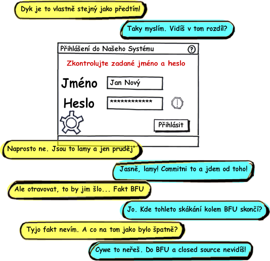 Zkoušel jsem si představit, jak by podobný přístup vypadal aplikovaný na jiné životní situace. Představil jsem si, jak jdu na úřad, podám úřednici vyplněný formulář, a ona mi ho vrátí se slovy: „Špatné jméno!“ A to je všechno. Víc nic. Hádej, hadači, zjisti si co bylo špatně a oprav to, lamo! Vyděšený sedám do auta, jedu domů, a najednou mě zastaví policajt: „Dál nesmíte jet!“ – „Proč, co se děje?“ – „Dál nesmíte jet!“ – „Udělal jsem nějaký přestupek, nebo je něco v nepořádku s autem?“ – „Dál nesmíte jet!“ – „Je tam něco zavřeného? Něco se stalo?“ – „Dál nesmíte jet!“ – „Mám jet jinudy?“ – „Dál nesmíte jet!“ Vyděšený se rozhlížím po autě, hýbu páčkami, a najednou se ozve: „V pořádku, můžete pokračovat!“ Zdeptaný odjíždím a za mými zády povídá policista kolegovi: „No viděls to, takový BFD?! Ani neví, že má svítit!“