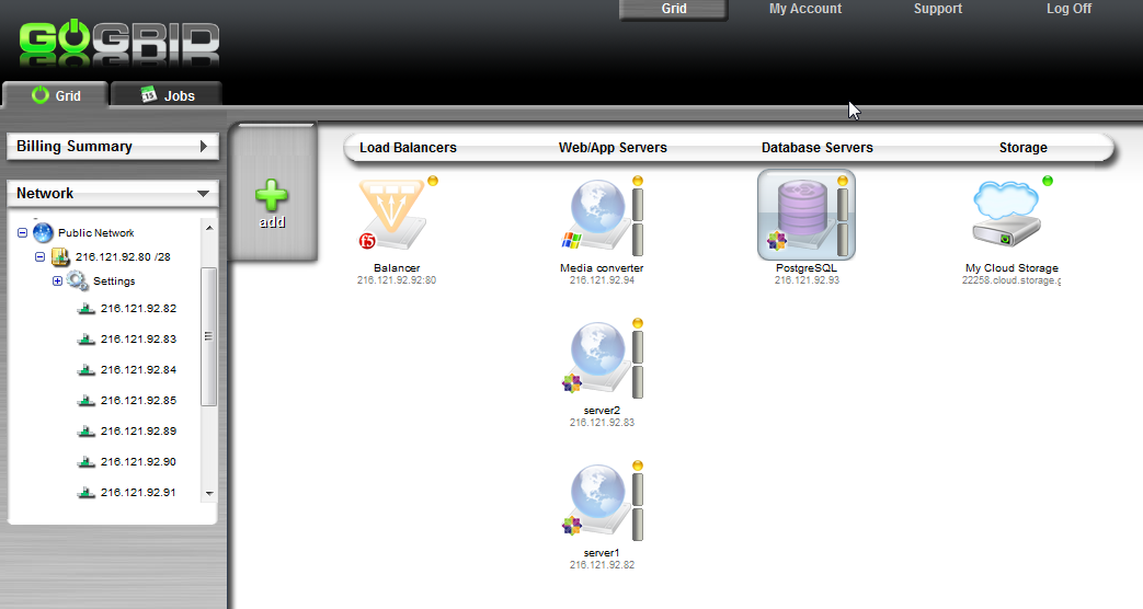 GoGrid je opět obdobou výše zmíněných, s drobnými rozdíly, např. nenabízí veřejný přístup k datovému úložišti. Už podle uživatelského rozhraní je GoGrid určen pro aplikace, které využijí load balancer, několik serverů, několik databázových strojů a datová úložiště.