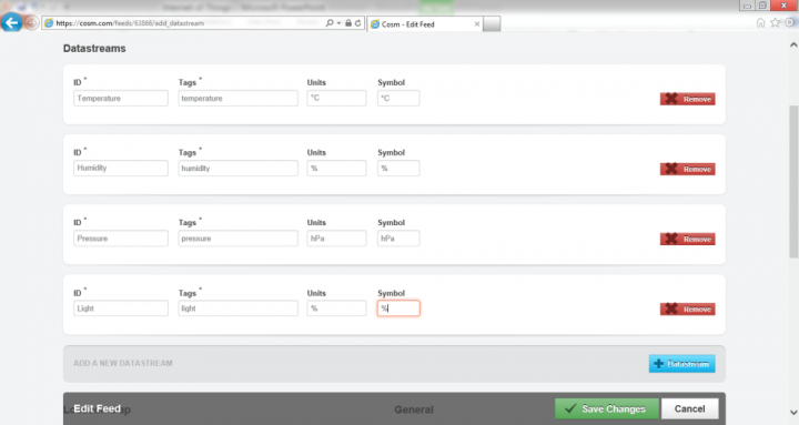 Pokud budete chtít data publikovat do internetu, máte v podstatě dvě možnosti. Napsat si vlastní službu nebo využít nějakou existující službu. Já osobně používám projekt Cosm, dříve Pachube. Tento projekt má velmi jednoduché rozhraní pro publikování dat. Základem je tzv. feed, který obsahuje nejméně jeden datastream. Datastream je vlastně hodnota z jednoho senzoru a feed sdružuje hodnoty z různých senzorů dohromady.