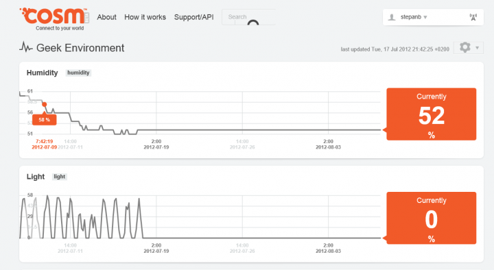 Nejdříve si vytvořte účet a feed na serveru Cosm, kam budeme odesílat teplotu piva. Budete potřebovat feed ID a API Key. Data můžete publikovat v různých formátech – CSV, JSON a XML. Podívejte se na dokument Start using curl, kde se naučíte základy komunikace.
