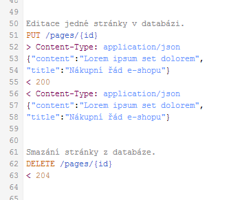 V administraci Apiary je k dispozici zvýraznění syntaxe, takže např. popis editace a mazání jedné stránky může vypadat takto: