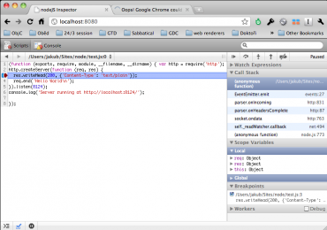 Ačkoliv je Node prostředí mladé, máte překvapivě hned několik možností, např. integrovaný debugger v Eclipse či command-line debugger. Autor článku za vás ale autoritativně vybral interaktivní debugger založený na JS debuggeru ve Webkit Inspectoru (debuggeru v Chrome a Safari). Poprvé si na něm taky v praxi ukážeme, jak nainstalovat npm modul (nezapomeňte změnit vlastníka /usr/local a vnořených složek pro aktuálního usera):