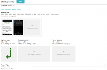 Přidáme dva screenshoty (dva jsou minimum, ale určitě platí čím více, tím lépe) a ikonu ve vysokém rozlišení. Kdybychom uploadovali reálnou aplikaci, určitě by stálo za to přidat feature graphic, což je obrázek, který se uživateli zobrazí ve hlavičce webové stránky vaší aplikace, i promo graphic, který se může objevit například ve výchozí obrazovce Play Store aplikace na telefonech. Promo video nemáme.