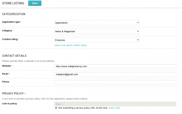 Naše aplikace je aplikace, která se nejblíže týká novin a časopisů a není nijak mravně závadná. Podle toho vyplníme sekci Categorization. Kontaktní informace už byly předvyplněny (a měnit je nepotřebuji), žádná pravidla ochrany osobních údajů nemáme, a to tedy zaškrtneme. Pak už zbývá jen klepnout na Save.