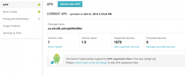 Možná jste si všimli, že v menu naší přidané aplikace se vedle Store Listing objevila zelená fajfka indikující, že je všechno v pořádku. Ta ale ještě není u APK ani Pricing and Distribution. Tak začneme třeba APK souborem.