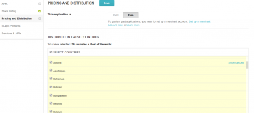 Aplikaci nabízíme zdarma, takže necháme vybráno This application is free (já bych stejně ani placenou vydat nemohl, protože nemám vytvořený merchant account). A vybereme, že se může používat ve všech státech.