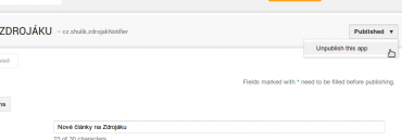 Vpravo nahoře je vždy vidět současný stav aplikace a po kliknutí na něj jsou nám nabídnuty další možnosti – pokud je aplikace publikovaná, můžeme ji odpublikovat. Pokud publikovaná není, můžeme ji buďto publikovat, anebo si můžeme nechat vysvětlit, proč to zatím nelze (vypsat seznam věcí, které ještě musíme udělat).