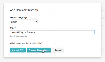 Na rozdíl od starší verze teď nemusíte mít připravený APK soubor. Musíte zadat jméno aplikace, výchozí jazyk a vybrat si, jestli chcete nejdříve uploadovat APK, anebo vyplnit informace o aplikaci. Já nejprve vyplním třeba informace o aplikaci.