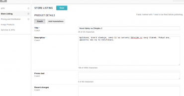 V nové Konzoli je formulář rozdělený na několik částí a hned celý proces působí mnohem svobodněji. Musím vyplnit Description, což je text, který se zobrazí v detailu aplikace. Promo text není povinný, takže ho vynecháme (ačkoliv, pokud to myslíte s aplikací vážně, určitě má smysl využít všechny různé možnosti, které Google Play nabízí), stejně jako nedávné změny.