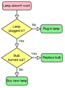 <figure role="group"> <img src="flowchart.gif" alt="Co dělat s nefunkční lampou."> <strong>Co dělat, pokud lampa nesvítí?</strong> <ol> <li>Zkontrolujte, zda je zapojena do zásuvky. Jestliže ne, zapojte ji.</li> <li>IJestliže ano a stále nesvítí, zkontrolujte, zda není spálená žárovka. Pokud ano, vyměňte žárovku.</li> <li>Jestliže lampa ani po výměně žárovky nesvítí, kupte si novou lampu.</li> </ol> </figure>