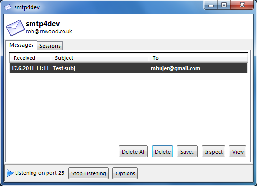 Tzv. dummy (neboli fiktivní) SMTP server je aplikace, která se z pohledu PHP chová jako běžný SMTP server, ale e-maily si nechává v sobě a nikam je neodesílá. Nemůže se vám tedy stát, že odešlete něco, co jste nechtěli. Jako příklad použijeme smtp4dev (spoustu dalších si můžete najít vyhledáním dummy smtp server). Program se po spuštění tváří jako lokální SMTP server, takže stačí v php.ini změnit SMTP: