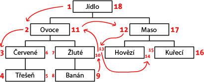 Začneme tím, že si strom překreslíme do jiné podoby – jako kdybychom ho kreslili na papír. Začneme u hlavního uzlu („Jídlo“) a napíšeme 1 na jeho levou stranu. Budeme pokračovat na prvního potomka a napíšeme 2 vedle něj. Touto cestou „jdeme kolem stromu“ (pozn. překl: v angličtině traverse – v překladu „překračovat“, proto pro tento typ používám název „traverzování kolem stromu“.) Při procházení stromu píšeme čísla nejdříve na levou stranu a vždy, když jsme na nejspodnější části, přecházíme na pravou stranu – poslední číslo je napsané na pravou stranu uzlu „jídlo“. Níže můžete vidět obrázek s celým očíslovaným stromem: