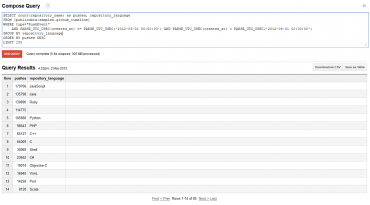 Ta pravá legrace ovšem nastává při použití Google BigQuery, který umožňuje se pomocí SQL tohoto archivu dotazovat. Kupříkladu pomocí tohoto dotazu zjistíte, jak na tom bylo přispívání do jednotlivých projektů v tomto březnu napříč programovacími jazyky: