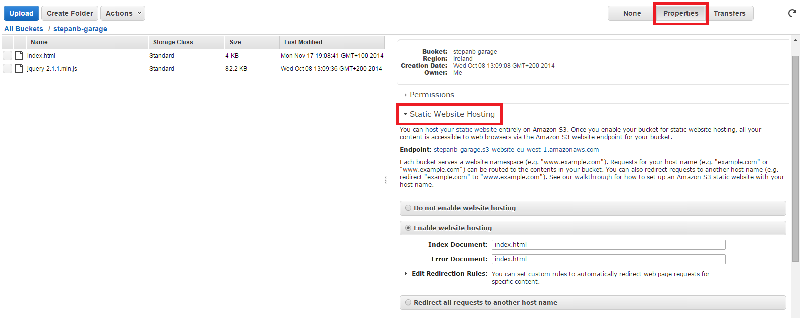 Po vytvoření Bucket je třeba nastavit konfiguraci pro statické hostování webových stránek.