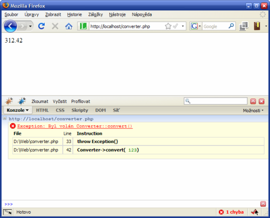 Ve Firefoxu zapněte Firebug a povolte panel Síť (Net), čímž aktivujete i FirePHP. Otevřete si náš prográmek a klikněte na panel Konzole. Ha! Sem se přesunula chybová hláška.