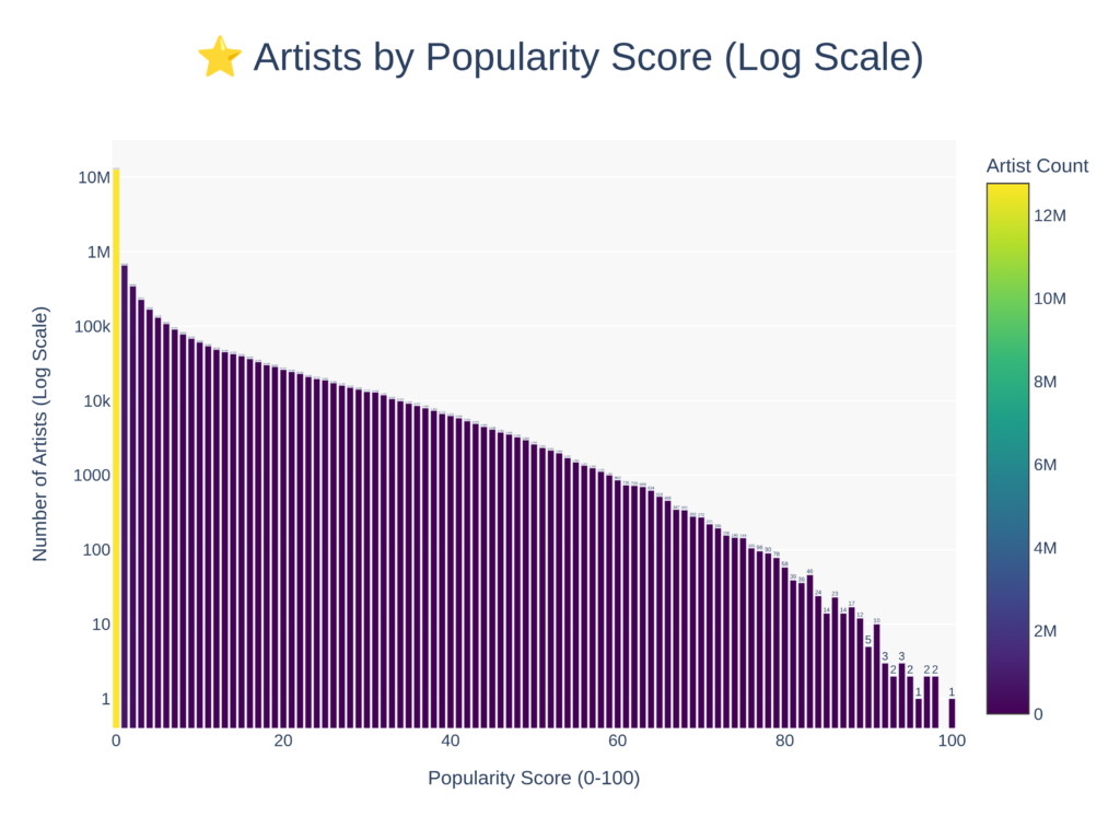 Můžeme také odhadnout, že top 3 skladby mají vyšší celkový počet streamů než spodních 20-100 milionů skladeb dohromady: