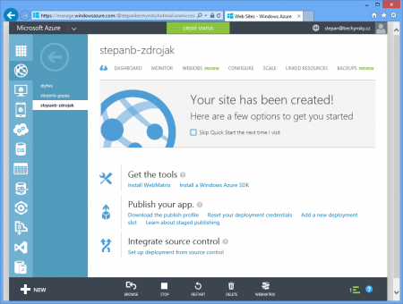 - URL aplikace je asi jasné. Aplikace se nejdříve nasadí na doménu třetí úrovně, které pak můžete nastavit doménu druhé úrovně. Pole WEB HOSTING PLAN vám umožňuje sdružovat Web Sites z hlediska nastavení. V poli REGION vyberete datové centrum, kam chcete aplikaci nasadit. Po chvilce máte prostor připravený.