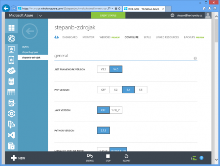 Zatím nás bude zajímat jen záložka CONFIGURE. Na této záložce si vyberete verzi PHP a můžete zapnout různé typy logování chyb na serveru. Některé vlastnosti jsou dostupné pouze pro placené varianty Web Sites.