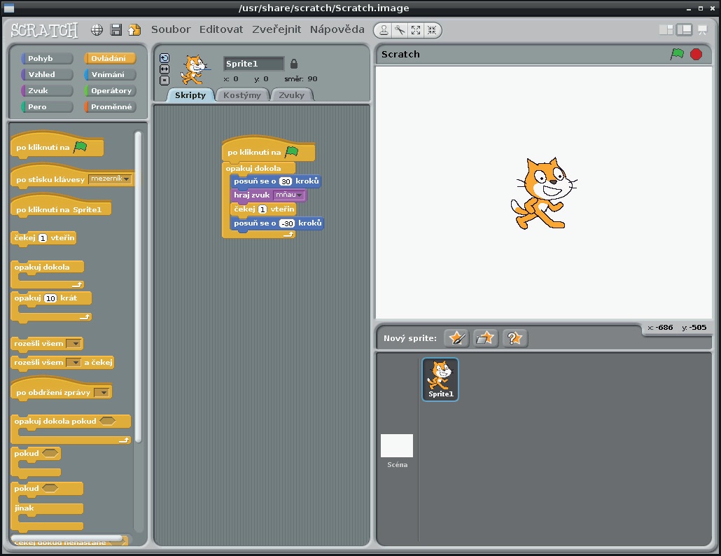 Tip: Jazyk Scratch přirozeně podporuje multithreading a částečně je objektově orientován. To znamená, že ke každému objektu v programu (včetně postav) lze připojit vlastní kód a všechny dílky kódu mohou fungovat souběžně a nezávisle na jiných dílcích. Když tyto možnosti vhodně uplatníte, můžete díky nim vytvářet poměrně složité programy.