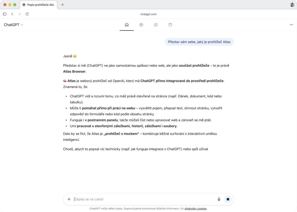 Společnost OpenAI, tvůrce populárního chatbota ChatGPT, představila svůj vlastní webový prohlížeč s názvem Atlas. Spuštění prohlížeče, který je prozatím dostupný pro macOS a brzy má dorazit i na Windows, iOS a Android, představuje přímou výzvu pro dominanci prohlížeče Google Chrome.
